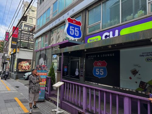 今日は17時入りだったんで、ちょうどそのくらいに到着しました本日の会場キョンソンデの「OL'55」に。 反対側から見るとこんな感じねw 思いっきりトム・ウェイツがいるからすぐ分かると思いますwwwwww ここ「OL'55」は地下鉄2号線慶星大・釜慶大駅の3番…